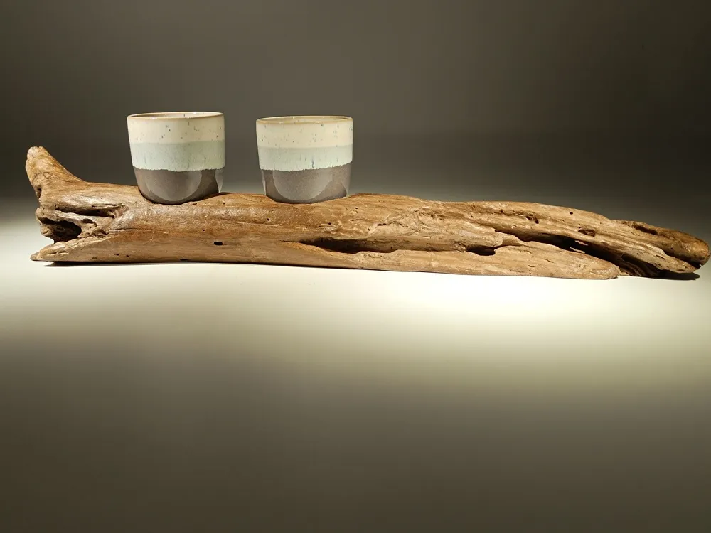Cette pièce utilise un bois flotté aux formes naturelles et ajourées pour servir de support à deux tasses en céramique aux dégradés de couleur s'harmonisant avec la teinte du bois. L'ensemble évoque un univers maritime rappelant le bois poli par les vagues et le sable, et les couleurs du ciel et de l'océan. L'aspect brut et noueux du bois est en opposition avec la douceur des tasses, créant par la même un équilibre harmonieux.