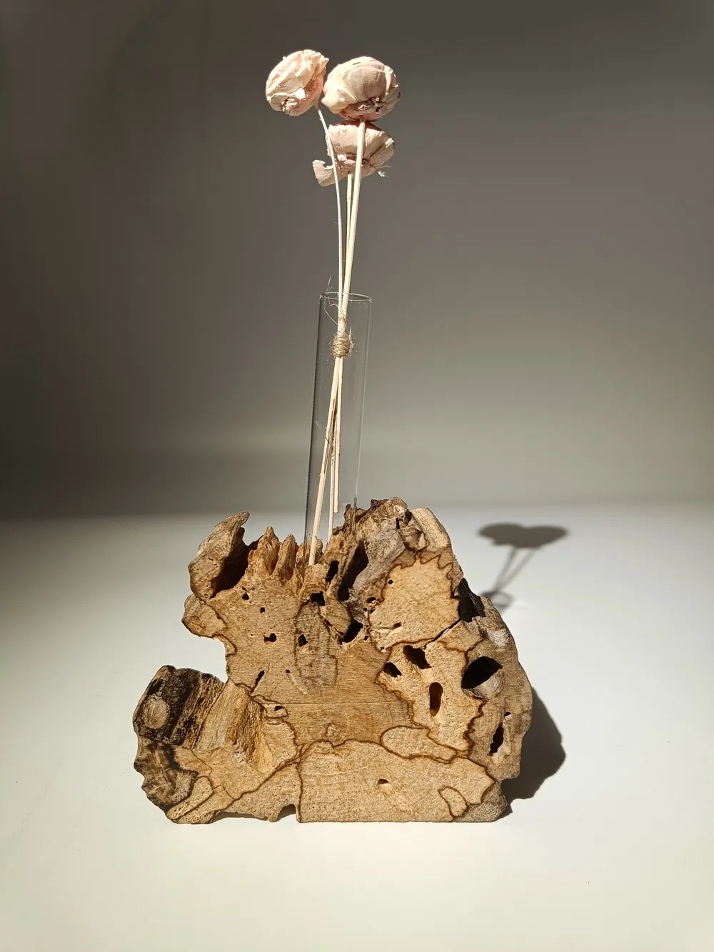 Cette création est une pièce artistique mêlant bois et verre dans un équilibre harmonieux. La base en bois flotté très structurée dont la forme et ses nervures naturelles sont mises en valeur, lui donne un aspect organique et brut. Cette pièce, chaleureuse et raffinée saura mettre vos fleurs dans un écrin de douceur. Cela ajoutera une touche de douceur et de de poésie à cet ensemble