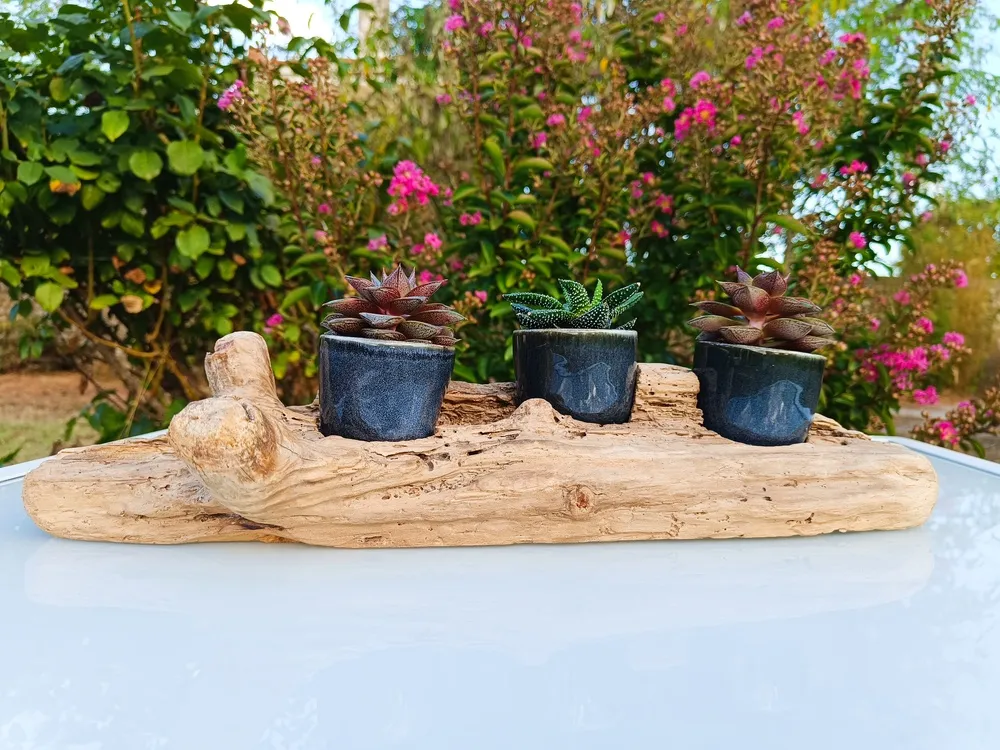 Cette création artisanale associe la douceur du bois flotté et l’élégance des plantes grasses. La base, façonnée naturellement par l’eau et le temps, sert de socle authentique à trois petits pots en céramique aux tons sombres et sobres. L’ensemble joue sur les contrastes : la chaleur du bois, clair et texturé, face à la profondeur des contenants et au vert vif des succulentes. Ce mariage simple et raffiné évoque à la fois la nature brute et la délicatesse du végétal. Chaque détail, des nervures du bois aux nuances des feuilles, invite à la contemplation. Cette pièce unique apporte une touche zen et contemporaine, parfaite comme centre de table, décoration intérieure ou mise en valeur d’un espace apaisant.