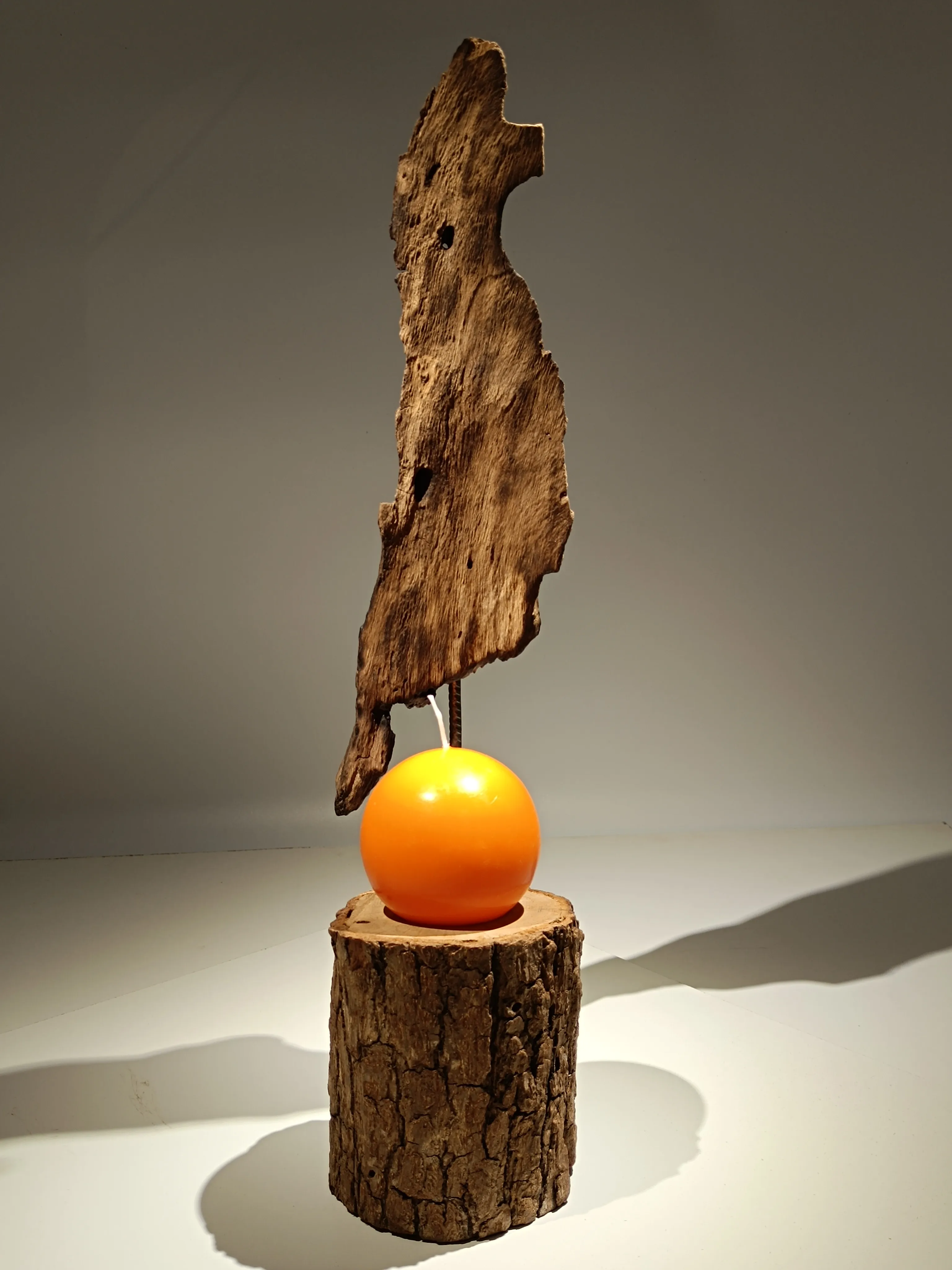 Cette pièce audacieuse associe la force brute du bois flotté à une composition minimaliste et contemporaine. Le bois, sculpté par le temps et les éléments, se dresse verticalement, offrant une silhouette élancée et organique. Sa texture irrégulière et ses perforations naturelles racontent l’histoire des courants et du vent. À sa base, un cylindre de bois brut accueille une bougie sphérique orange, apportant une touche vive et chaleureuse. Un support métallique discret relie les deux éléments, créant un équilibre entre rusticité et modernité. L’ensemble évoque la rencontre entre nature et design, idéal pour une décoration originale et zen. Cette création invite à la contemplation et à la lumière douce. Elle s’impose comme une sculpture fonctionnelle, à la fois décorative et poétique.