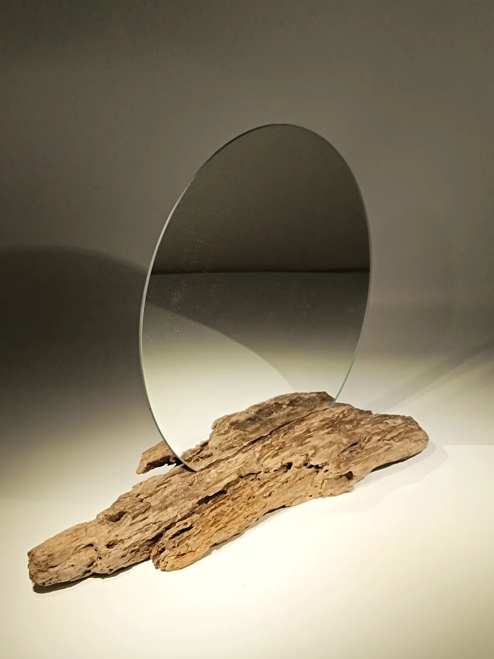 Cette pièce épurée marie la transparence du verre et la force brute du bois flotté. Le miroir rond semble émerger naturellement de la base en bois, comme une goutte de lumière posée sur une écorce ancienne. Sculpté et poli par l’eau, le bois conserve ses aspérités et ses nuances dorées, offrant un contraste harmonieux avec la surface lisse et réfléchissante du miroir. L’ensemble évoque le dialogue entre la nature et la modernité, entre le temps qui façonne et l’instant qui se contemple. Idéal en objet décoratif, il capte la lumière et invite à la sérénité. Une création sobre et poétique, à la fois ancrée et aérienne.