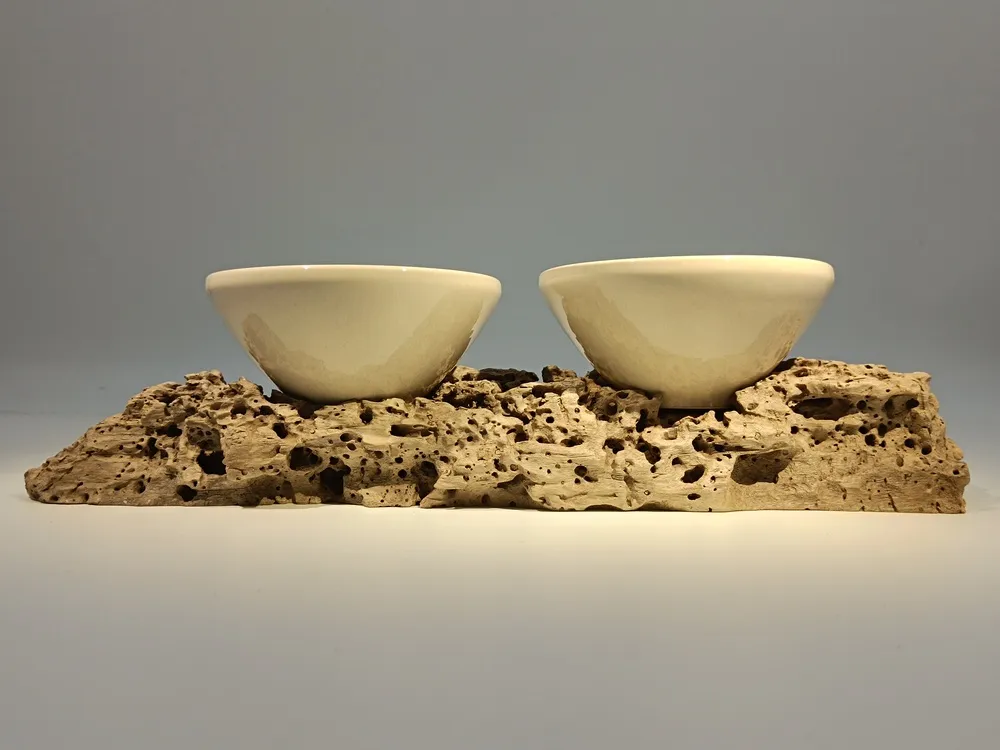Cette pièce unique associe la force brute du bois flotté à la douceur de deux bols en céramique aux tons naturels. Le bois, marqué par le temps et l’eau, présente une texture spectaculaire, percée de cavités et de reliefs qui rappellent l’action des éléments et le passage du temps. Les bols, aux lignes épurées et à la finition satinée, contrastent avec la matière brute, créant un équilibre subtil entre nature et élégance contemporaine. Cette œuvre peut servir de centre de table, de support décoratif ou de pièce artistique, apportant une touche organique et raffinée à tout intérieur. Elle incarne la beauté des matériaux simples sublimés par la créativité et l’artisanat.