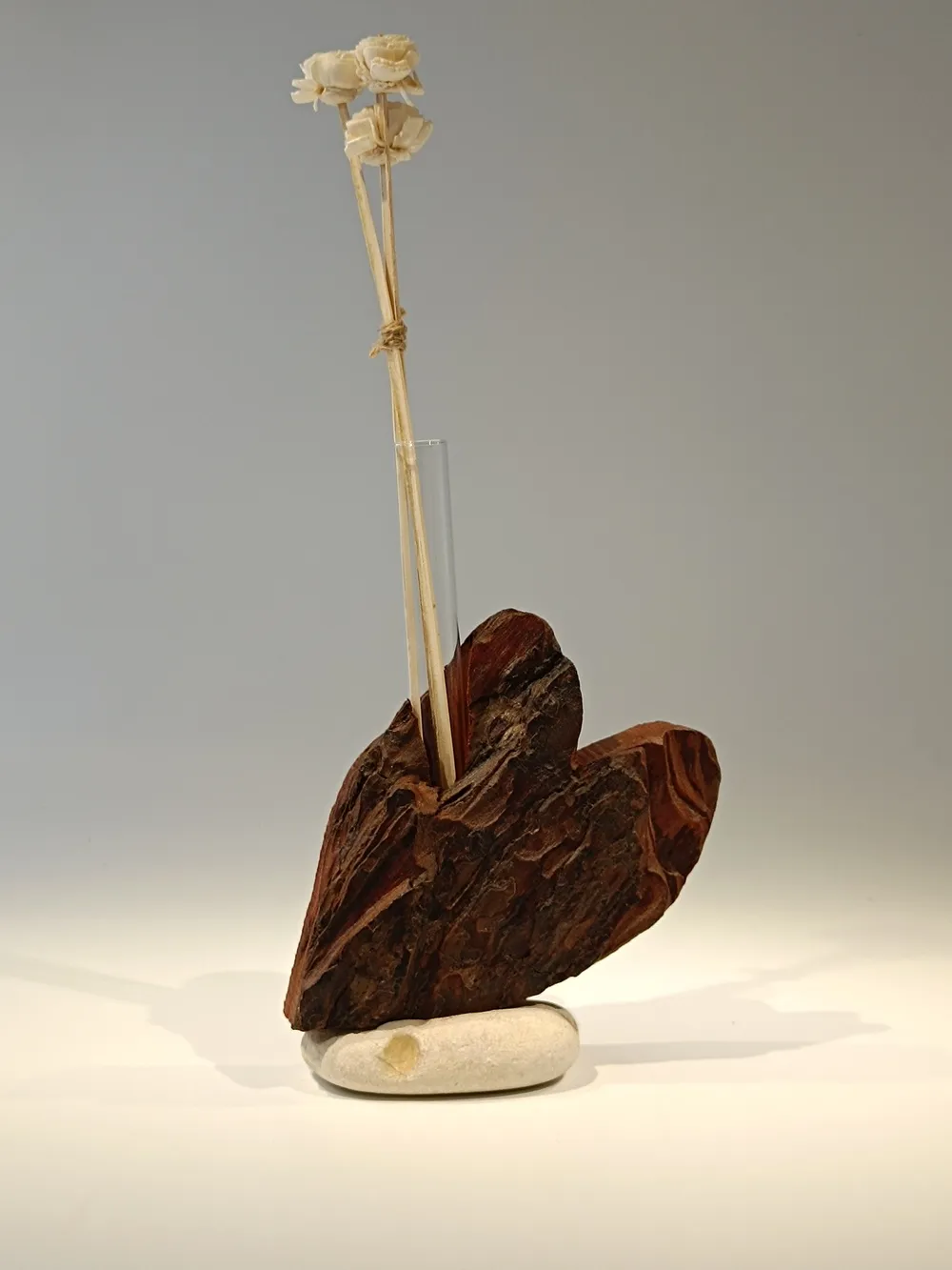 Sublimez votre intérieur avec cette création unique en bois flotté, dont les reliefs sculptés naturellement offrent une texture riche et captivante. Chaque veinure et fissure du bois raconte une histoire, créant un jeu d’ombres et de lumières fascinant. Son design vertical met en valeur cet effet brut, accentué par un soliflore en verre accueillant vos fleurs coupées. L’ensemble repose sur un galet clair qui stabilise la pièce et renforce son lien au rivage. Un parfait équilibre entre force naturelle et finesse artisanale, idéal pour une décoration zen et authentique.