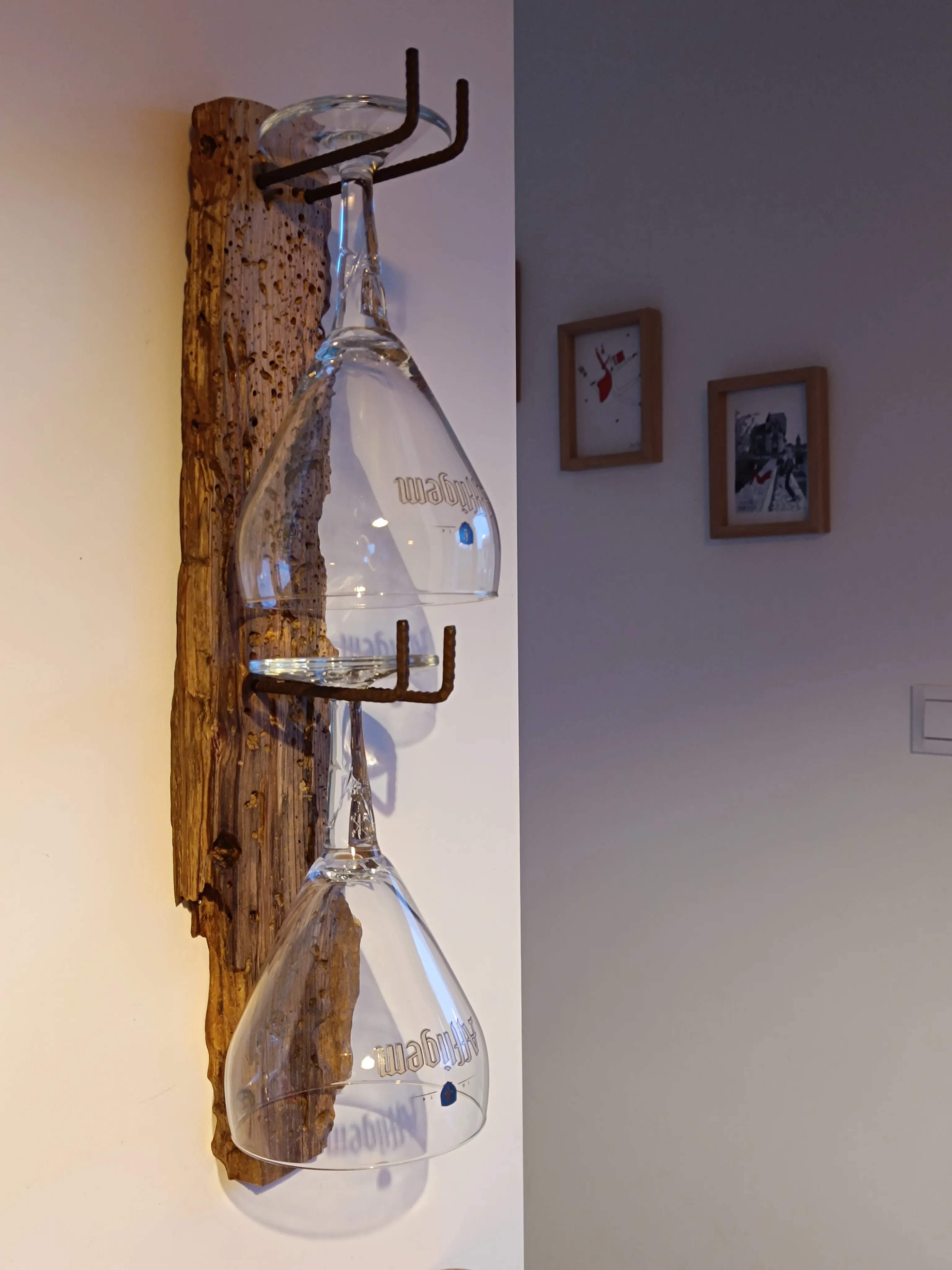 Cette création allie l’authenticité du bois flotté à la finesse du verre pour offrir un porte‑verres mural unique. Le bois, façonné par le temps et creusé par les éléments, dévoile une texture organique pleine de caractère. Ses aspérités naturelles contrastent magnifiquement avec l’éclat et la transparence des verres suspendus. Les supports en métal ajoutent une touche industrielle tout en soulignant la robustesse de l’ensemble. La composition joue sur les ombres portées, créant une ambiance chaleureuse et vivante lorsque la lumière s’y reflète. Cette pièce transforme un simple objet utilitaire en élément décoratif original. Elle évoque à la fois la nature brute, le bord de mer et l’artisanat. Parfait pour sublimer un coin bar, une cuisine ou un espace convivial, elle apporte une présence forte et authentique.