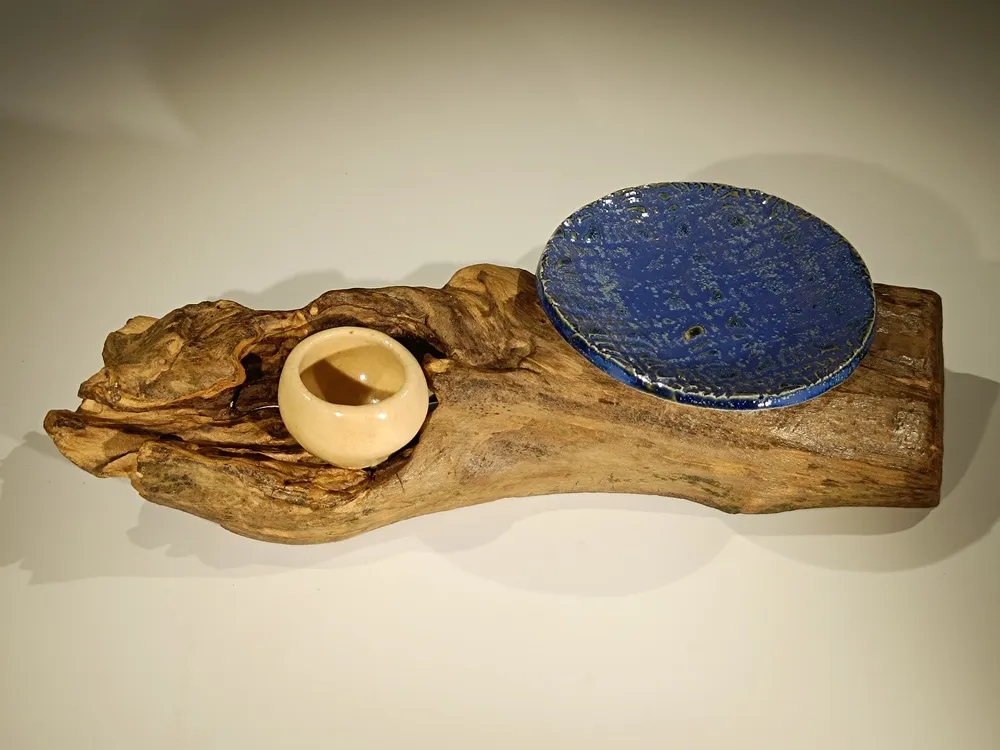 Cette création en bois flotté prend la forme d’un écrin naturel, façonné par l’eau et le temps. Sa ligne allongée et organique révèle les veines profondes du bois, aux nuances chaleureuses. Un disque en céramique bleu intense vient s’y poser comme une touche minérale et contemporaine. À ses côtés, un petit réceptacle arrondi accueille bagues, boucles d’oreilles ou petits trésors. Chaque élément trouve sa place dans un équilibre subtil entre brut et délicatesse. Pensé comme un dépose-bijoux, il transforme un geste quotidien en instant raffiné. La matière vivante du bois contraste harmonieusement avec l’émail texturé. Chaque pièce est unique, sculptée par la nature et sublimée à la main. Un objet décoratif à la fois pratique et poétique.