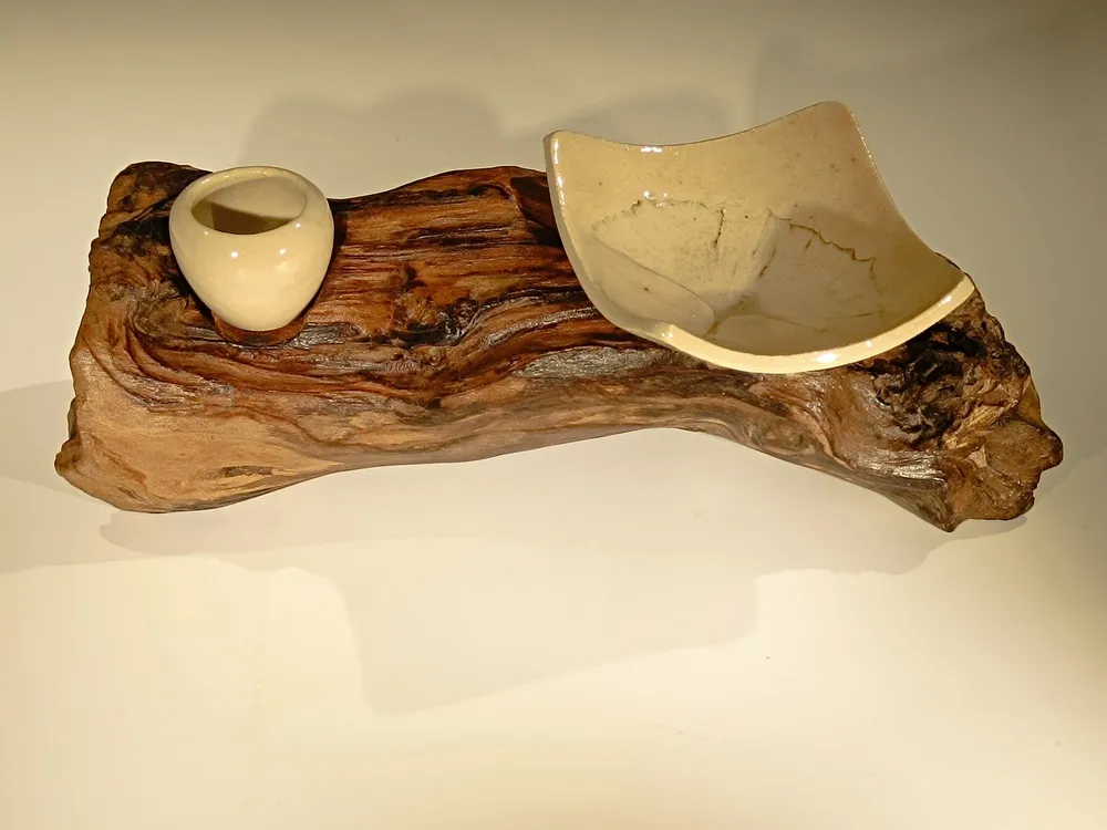 Cette création en bois flotté prend la forme d’un écrin naturel, façonné par l’eau et le temps. Sa ligne allongée et organique révèle les veines profondes du bois, aux nuances chaleureuses. Une coupelle en céramique crème imprimé d'une feuille vient s’y poser comme une touche minérale et contemporaine. À ses côtés, un petit réceptacle arrondi accueille bagues, boucles d’oreilles ou petits trésors. Chaque élément trouve sa place dans un équilibre subtil entre brut et délicatesse. Pensé comme un dépose-bijoux, il transforme un geste quotidien en instant raffiné. La matière vivante du bois contraste harmonieusement avec l’émail texturé. Chaque pièce est unique, sculptée par la nature et sublimée à la main. Un objet décoratif à la fois pratique et poétique.