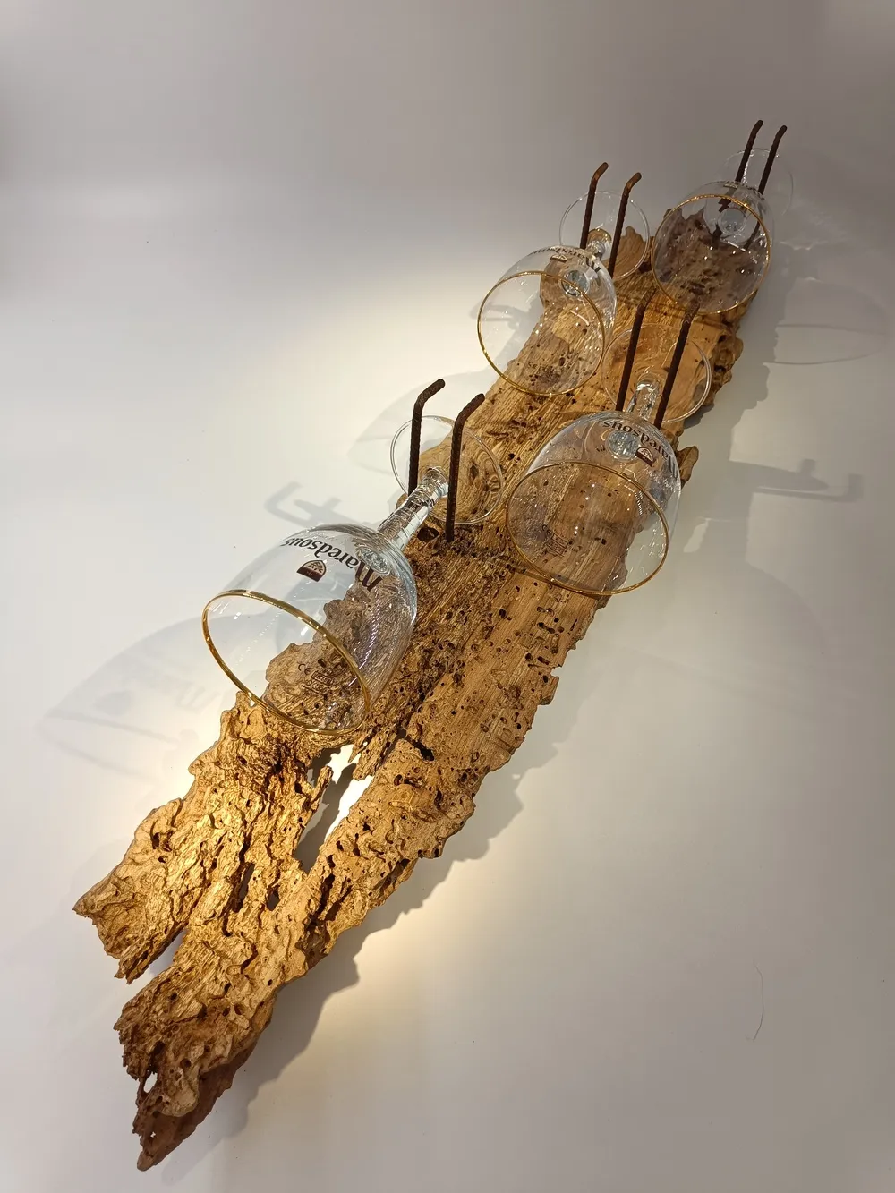 Cette création en bois flotté devient un porte-verres à la fois brut et raffiné. La pièce principale, sculptée par le temps et l’eau, dévoile une texture profondément marquée et vivante. Ses reliefs naturels contrastent avec la transparence délicate des verres suspendus. Les tiges métalliques apportent une touche industrielle subtile, renforçant son caractère contemporain. Chaque aspérité du bois raconte une histoire, chaque fissure souligne son authenticité. Pensé pour accueillir les verres à pied, il allie fonctionnalité et esthétisme. Installé sur une table ou un buffet, il devient un véritable centre d’attention. Objet convivial, il invite au partage et à la dégustation. Une pièce unique, entre art naturel et esprit bistrot chic.